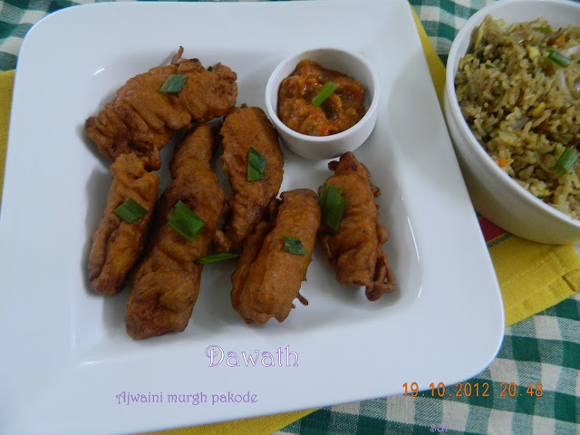 I just bought  season 1 Master Chef India winner Pankaj Bhadouria’s cookery book last week.It has eye catching pictures with excellent recipes of all the  Master chef anchor chefs recipe’s.So my daughter suggested me to try Ajwaini Murgh Pakode.Ajwaini Murgh Pakode is nothing but carom-seed flavoured chicken bites.So after our routine evening badminton play I fried this pakode for the hungry stomach’s and within fraction of few minutes there were only empty plates.