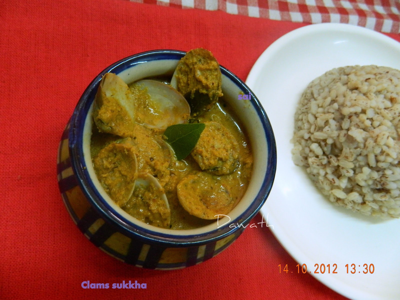 Clams sukkha or Kubbe sukkhe in Konkani is again a Konkani preparation.Kubbe means clams and Sukkhe means dry .They are surprisingly high in Iron.They are a good source of phosphorus,Zinc,Copper etc. Seafood is generally cooked in mud vessels in South Kanara as it enhances the flavor.Coming back to the recipe this is again my mom’s recipe.This dish is my son’s favorite dish.He enjoys this dish so much there is no need to dish wash his plate  after his food.