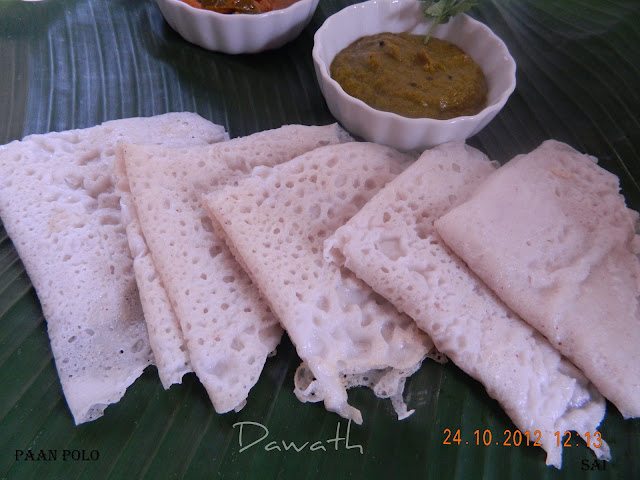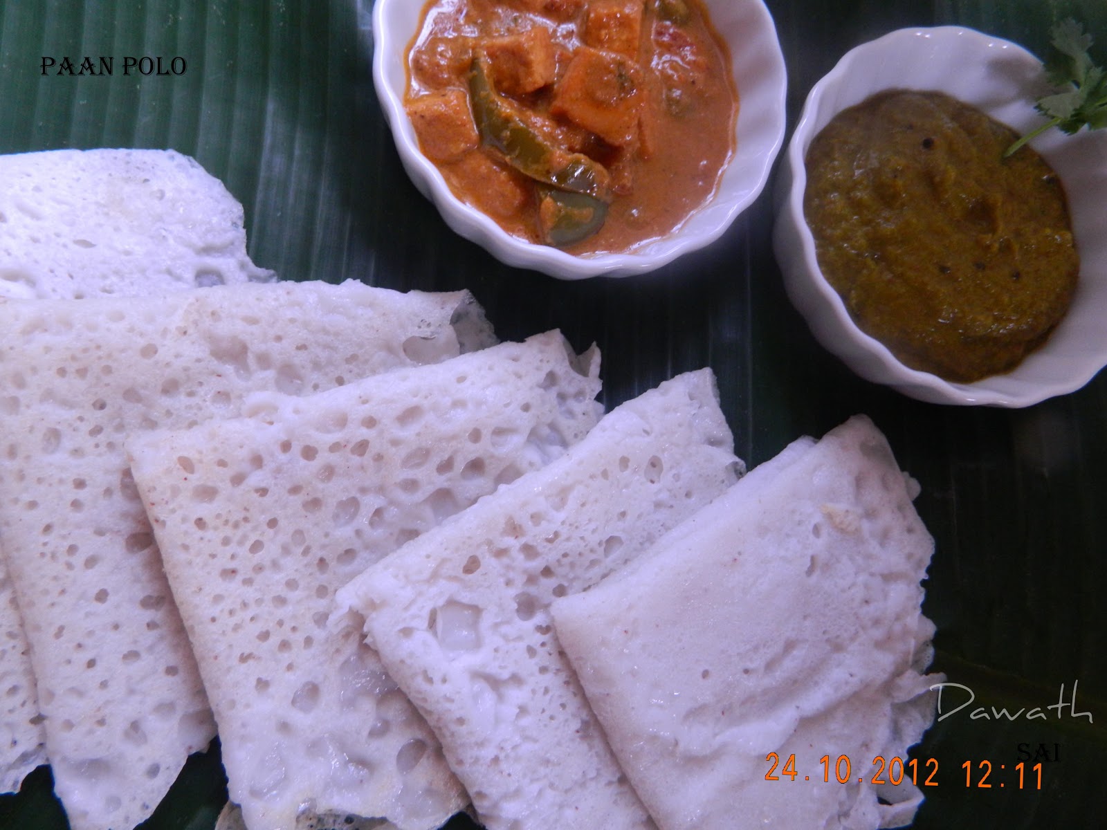 Paan polo or Neer dosa is a Mangalorean Delicacy.It is prepared in most of the households in Mangalore.In konkani it is called as Paan Polo.Paan means leaf and polo means dosa which means as light as a leaf.Neer dosa or water dosa is very soft and very light.It is normally served with grated coconut and jaggery mixture,Ravo (jaggery syrup) or chutney.In Mangalore we get the best Paan polos in Ideal Cafe restaurant, which tastes heaven with Soya chunks ghee roast.