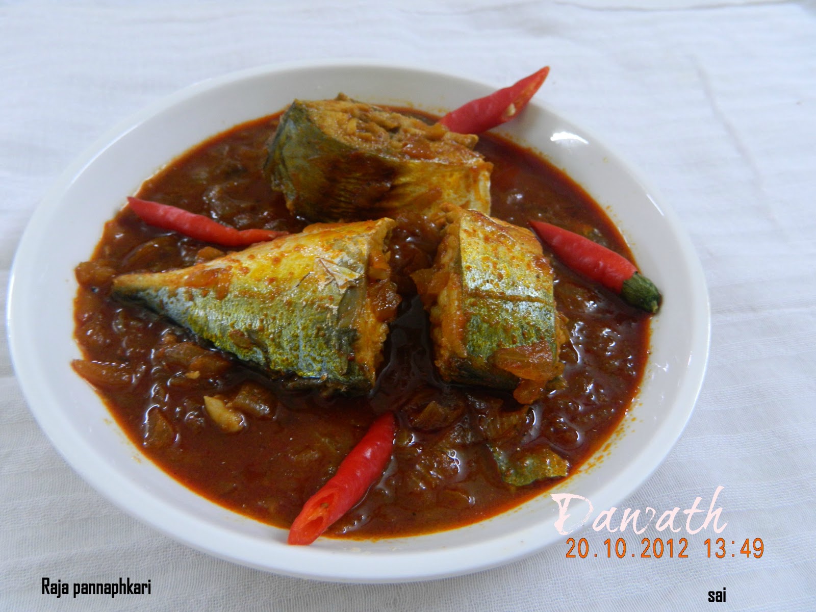 Raja pannaphkari is a traditional Konkani preparation.This is a very spicy dish.Raja means Mackerels and pannaphkari means curry made with chillies.I’m a sea food lover and my loved ones call me “jhalke majjar” in our mother tongue Konkani which means I love fish as much as cat loves fish.This recipe is of my mother.So here goes the recipe.