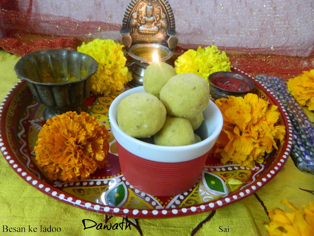 Happy Dhanterus to all!This is my 75th post.My baby blog is growing day by day.And I am really very happy for the response that I am getting and inspiring me more to do my job better. Dhanterus is the first day of the five day Diwali festival.The word Dhan means wealth and therus means 13th day as per the Hindu calendar.So today and the following next 4 days are very auspicious to us.Coming back to the recipe Besan means gram flour.I adapted this recipe from Sanjeev kapoor’s book and adjusted the measurements as per my needs.This ladoo is very popular and very easy to prepare.I dedicate this ladoo for my blog and for you people for Dhanterus!
