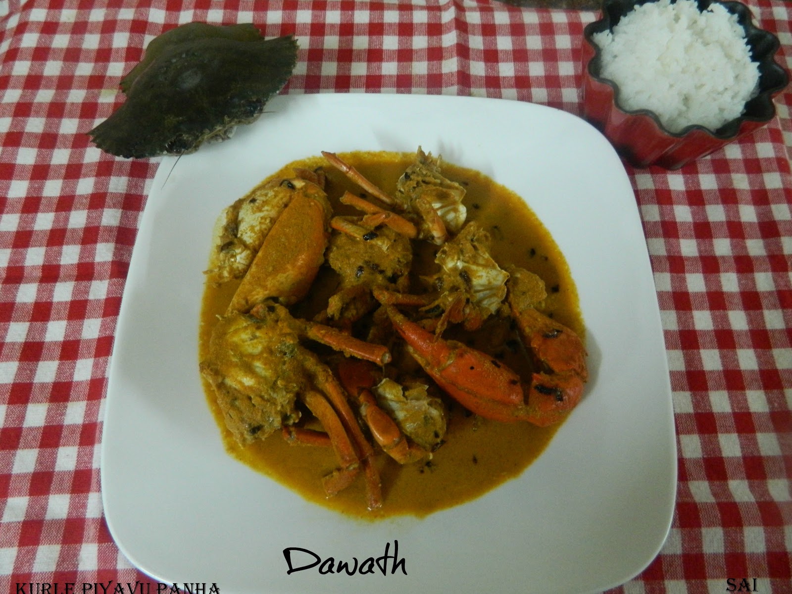 Kurle piyavu panha is a traditional konkani preparation. Kurle means crab,piyavu means onion and panha means seasoning which means crab curry seasoned with onions.This curry goes well with boiled rice.My mamama and amma used to prepare this authentic dish very well,especially we used to eat this in the brass plate at my mamama’s house.The minute we used to go to my mamama’s(maternal grandmother) house ,my maamu(maternal uncle),used to get giant live crabs from the market and we used to enjoy the sight of the crab running here and there and mamama used to clean it very beautifully,so did my amma and I have also inherited a lot of things from them.Poor mamama, the crabs used to attack her hands by pricking with its sharp legs,but she was also very clever to handle them.So there would be literally a war between crab and mamama,lol, and my mamama was always Jhansi ki rani. And she used to help us out from separating the flesh from the crab while we used to have our lunch and sit with a pounding stone to break open the crab pincers(daang),that was the crab cutter of our times……Nostalgia…..Infact I use that traditional way to open the crab even now, despite having a crab cutter.