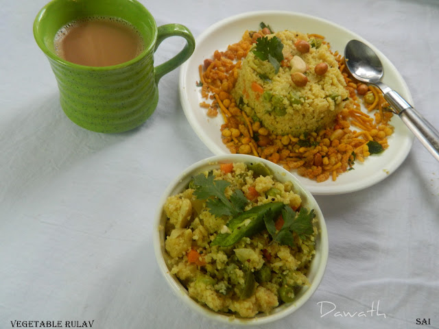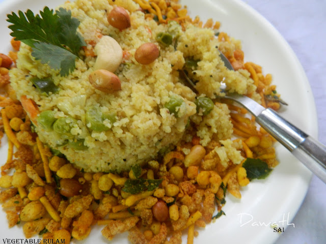 Vegetable rulam or rulav is vegetable upma with loads of vegetables for a healthy breakfast.This rulam is very colorful and eye pleasing.Even kids will relish this without any complaints. Khandwa suji is the main ingredient in this dish which is nothing but coarse semolina.You may eat it with any savories like mixture,sev or even with the curds.I learn’t this rulam preparation from my mother in law (mayi).So thank you mayi for this wonderful and healthy recipe.