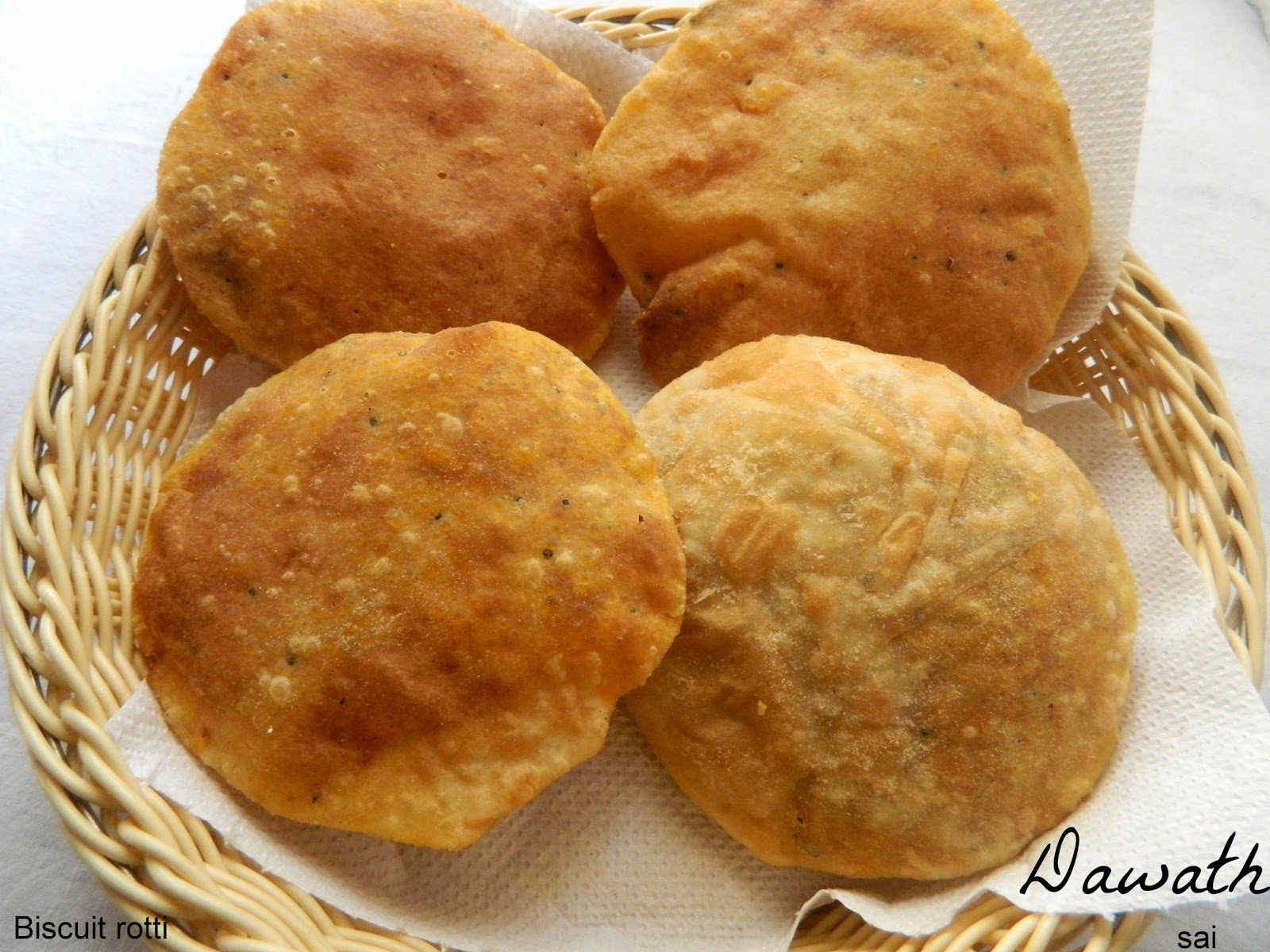 Biscuit rotti is a rich rotti  stuffed with spices and a popular  breakfast or evening snack  in GSB cuisine especially prepared when guests comes home or when you have ample time.There are various methods of preparing this rotti. This rotti is spicy and crispy and resembles like kachori. Goes well with a sip of piping hot coffee or tea and makes an excellent evening snack.Whenever we expect unexpected guests and are  short in time we get biscuit rotti from  Balli’s angadi (shop)  who sells these rottis and other fried munchies like hot cakes.There is so much demand for his fried munchies that people just flock around in the  evenings.In Mangalore few follow the tradition of  eating their evening snack either in Balli’s angadi or Taj mahal restuarant….These rotti s stay puffed and crisp for a long time. This recipe and rotti is a contribution from Santoshi.I will update with stepwise pictures when I prepare it .