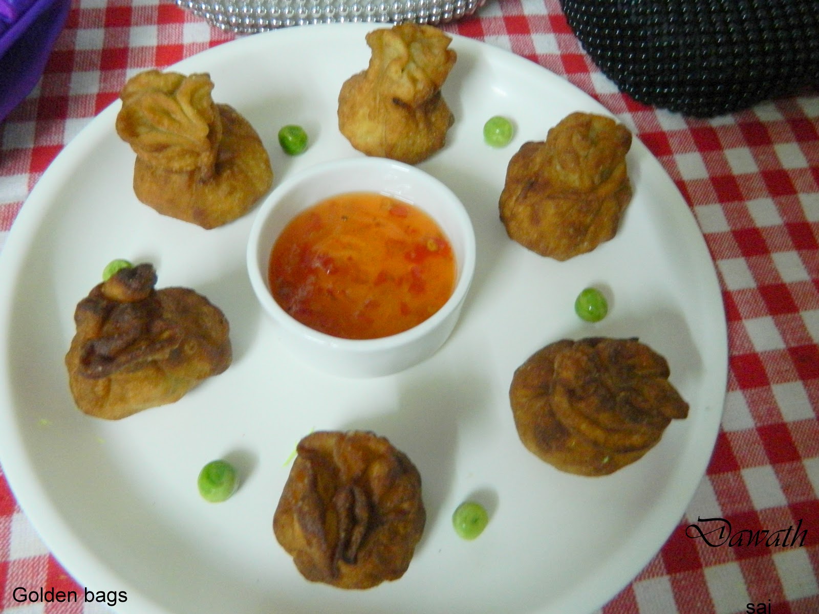 Golden bags are the sensational new look samosas of this generation.They are very eye appealing and will be a star of the show of any party.It makes an excellent starter.You may do the  stuffing of your choice,both veg or non veg.I used paneer as the main ingredient for the stuffing here.Other stuffing like corn,potato,babycorn etc may be used.