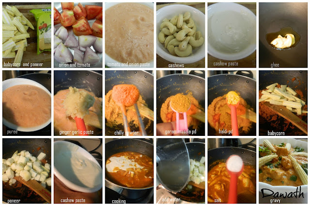 - Add babycorn and cook for sometime, then add paneer cook for 2 minutes and lastly add cashewnut paste,salt to taste and water as much as needed and adjust the consistency of the gravy.