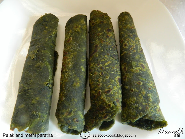 One more paratha ,Greeny, greeny,that too a very healthy one.I borrowed this recipe from my bhabhi Santoshi.Last week she had parceled the paratha s and my kids had a competition on eating it,and next day I had to prepare it.And why not ?These paratha s are so healthy.No compromise when it comes to health. Palak and methi are loaded with  full of nutrients.This paratha is one of the best paratha with the greens.You may also add  methi leaves  directly  to the dough and add curds or milk while kneading the dough.These paratha s turned super soft and tasty.If you  want the paratha s to be soft,once you fry it, immediately transfer it into the hot case and close the lid or you may also put it in a container and close the lid .This tip can be followed for the  chapatis too.
