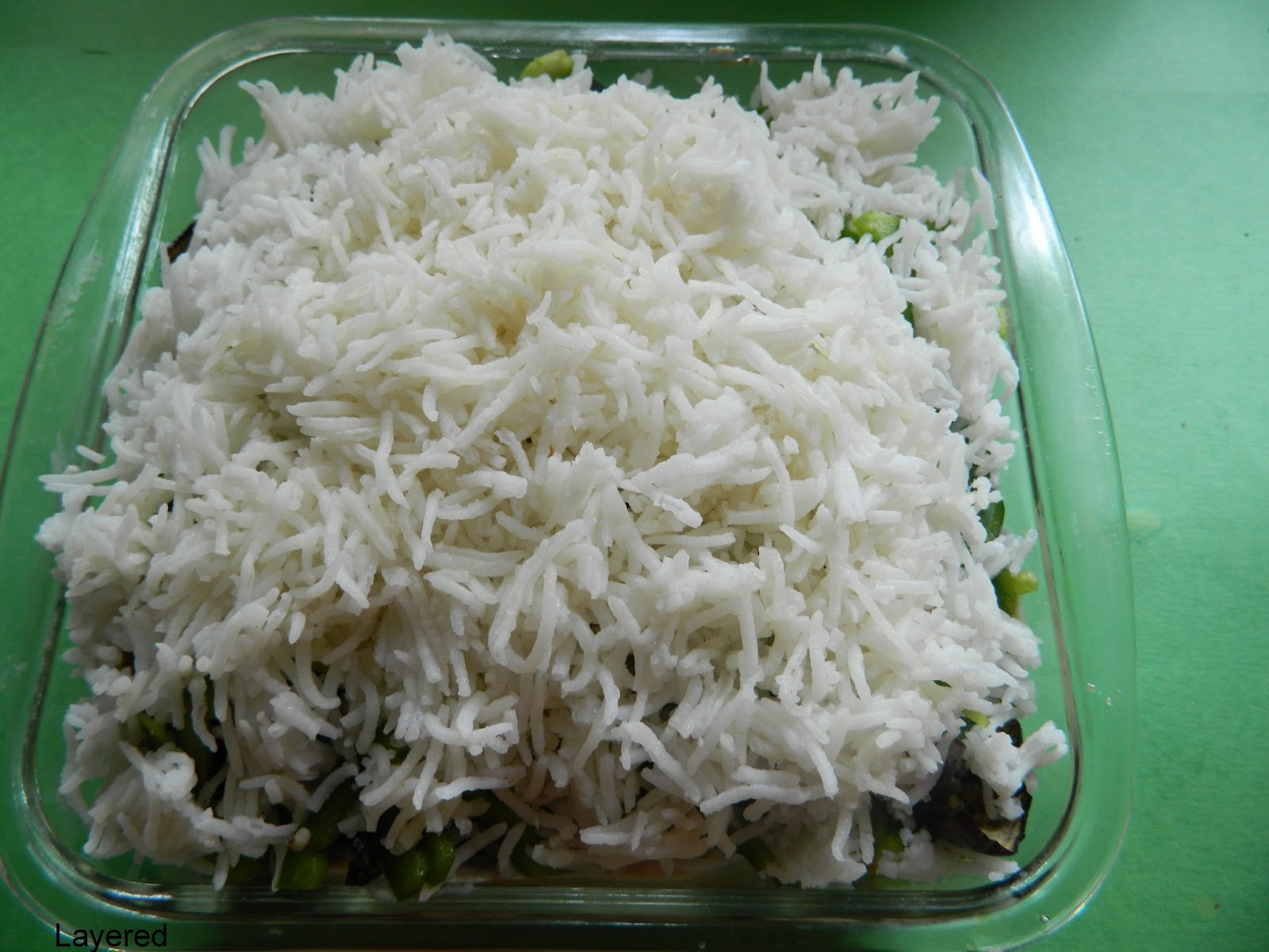 2. Again spread the rice,then the brinjals and then the red sauce,top with white sauce and lastly spread capsicums,cover the dish with an aluminium foil and bake in a pre heated oven for about 10 minutes at 200 deg C,uncover the casserole and bake further for 5 minutes.