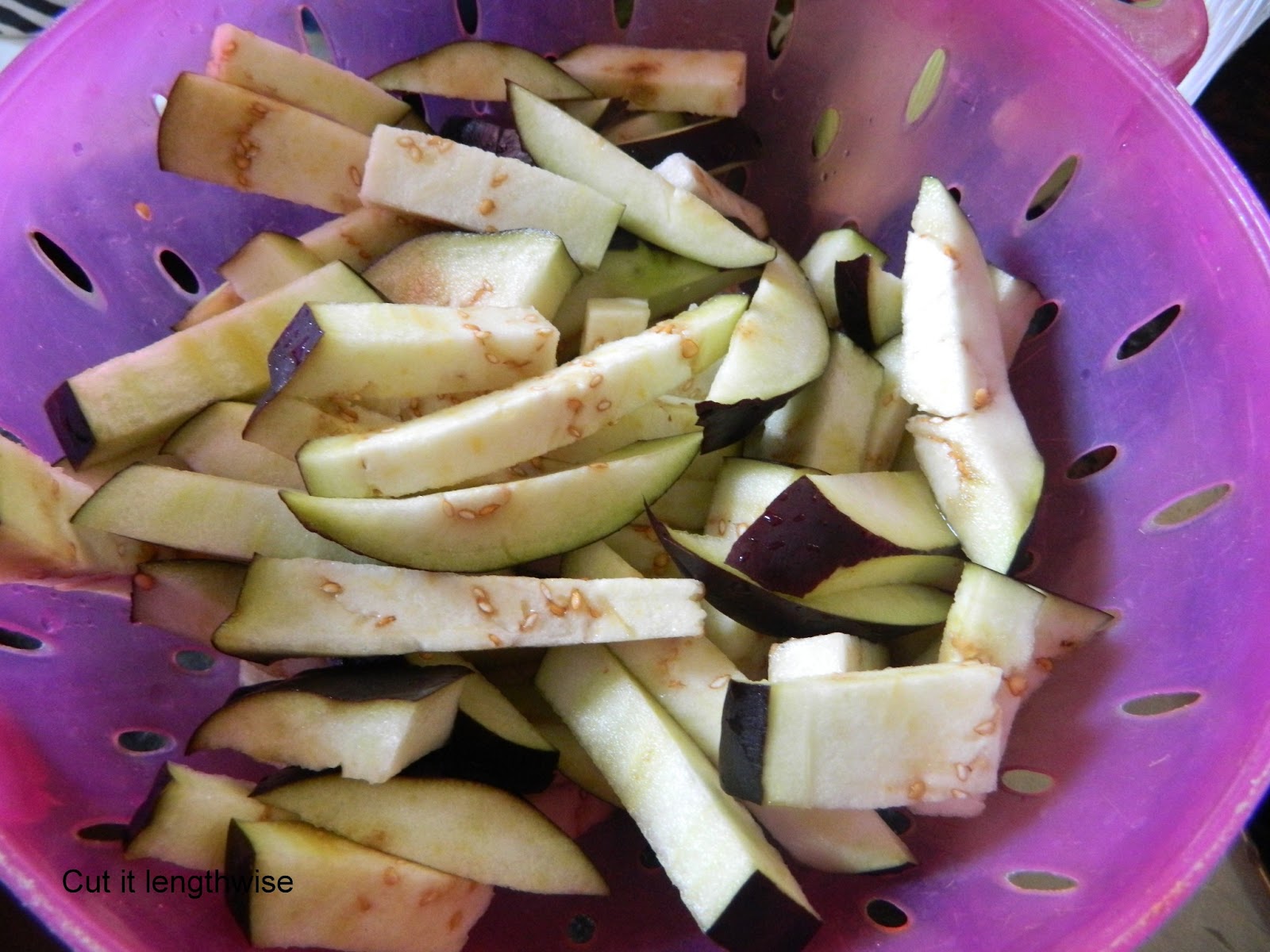 1. Sprinkle ¾ tsp salt on the brinjal pieces,mix and keep aside for ½ an hour to sweat.
