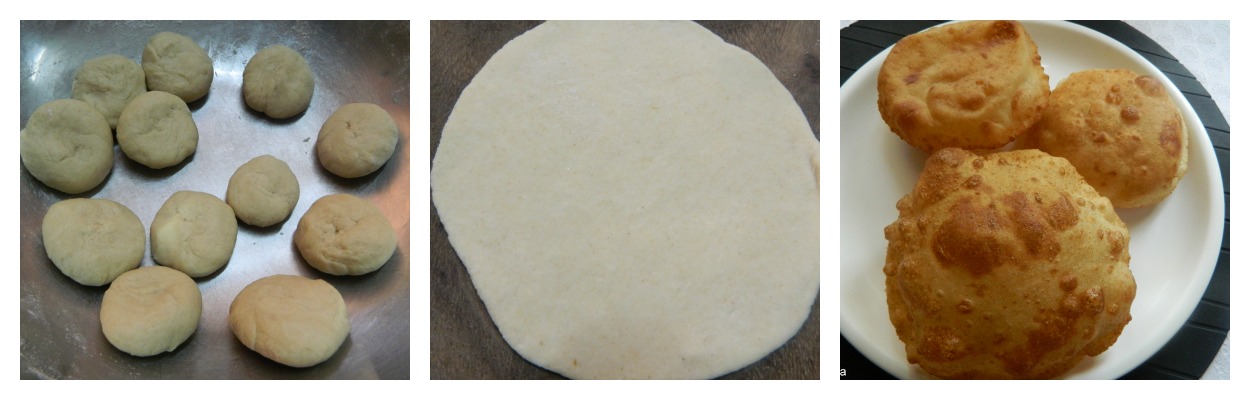 - Heat oil in a frying pan,when it is smoking hot,drop the puris into the hot oil and press it with a perforated ladle ,once it puffs turn the puri to the opposite side and fry it until light brown in colour.