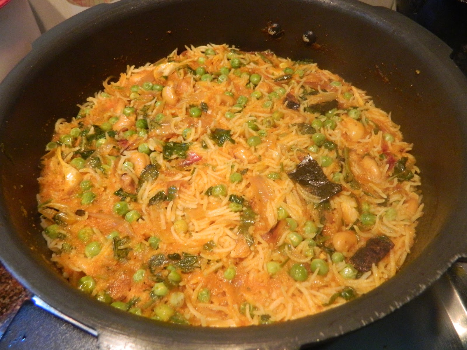 You may also prepare the rice in a rice cooker by adding 2 cups of water,2 tsp ghee,green peas and salt to taste,and then mix it with the masala for a better result.