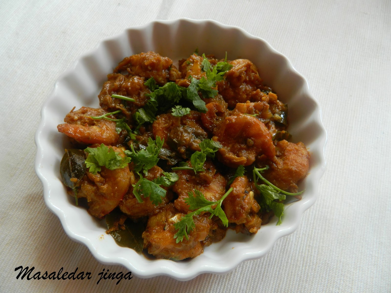 Masaledar jingha is a dish prepared with prawns.Jhinga means prawns and masaledar means various spices blended together.Original recipe called for eggs but I experimented with the prawns.I adapted this recipe from Aparna kamath’s blog.Aparna has a very good collection of recipes and I have tried various recipes from her blog and have liked it.Than you Aparna for this awesome recipe.Would want to try with the eggs too.