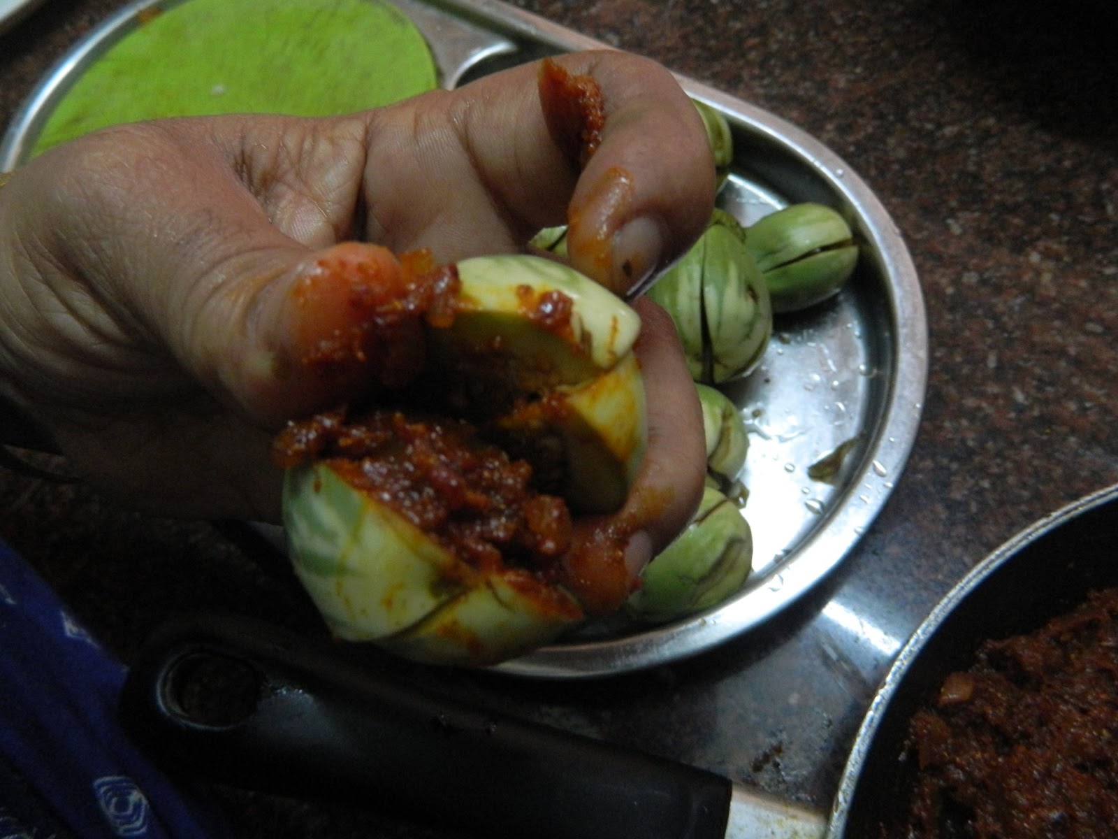 4. Stuff the masala in the brinjal with the help of a spoon or hand,heat remaining oil,arrange the stuffed brinjal,close the lid and cook until done.