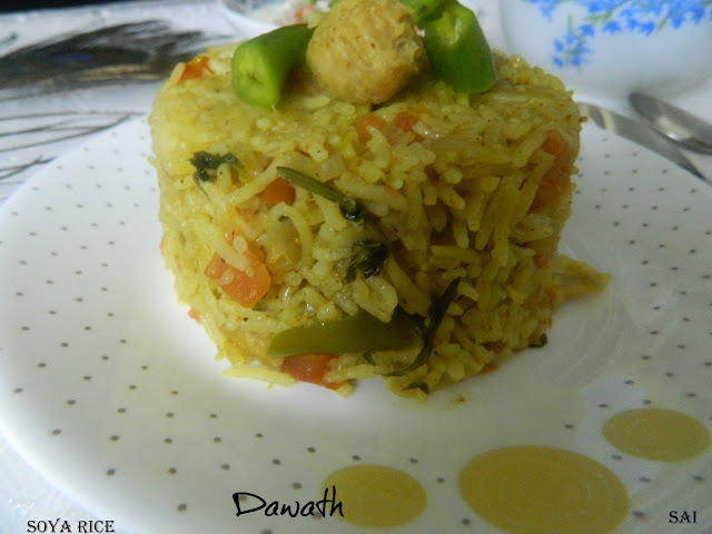 Soya rice is a pulav made with soya chunks.Soya chunks preparation is a favorite at our place.My daughter Sanju loves this rice ,so I prepare it very often.Soya chunks are rich in protein and has many other health benefits. Soya chunks is the best substitute to chicken.Many delicacies are prepared  like soya ghee roast, Manchurian to name a few.I have already posted the recipe of Masaledar soya biryani few days back.