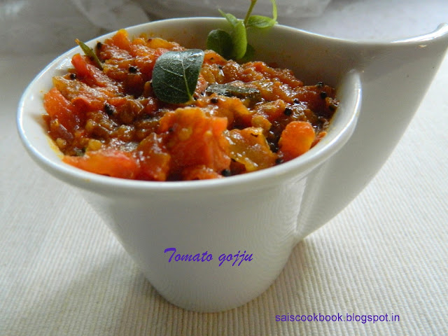 Tomato gojju is one of the very simple and common recipe . I learnt to prepare this gojju from my Mamama and I have been preparing this since long time . There are many variations with this recipe .  This chutney goes well with Paan polo,chapathi or puri.