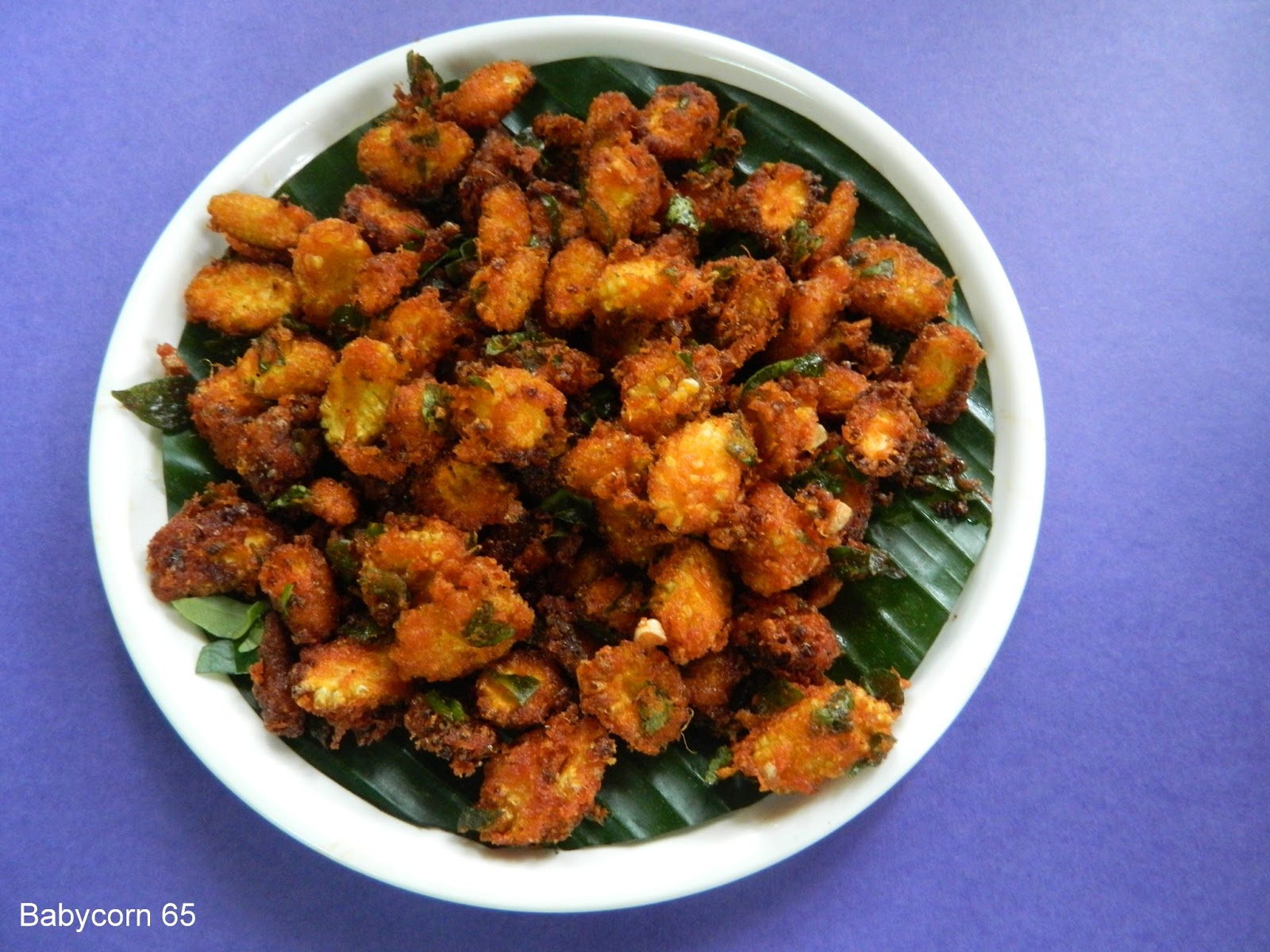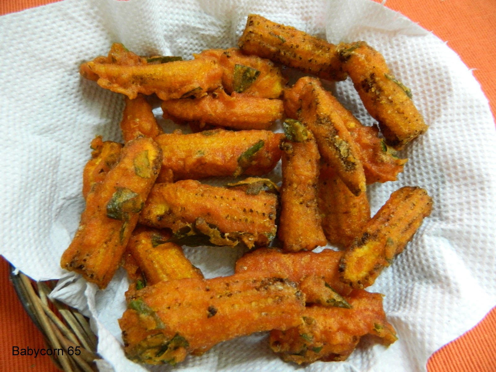 Babycorn 65 is one of the best starter I have ever tasted.No one can resist eating just one.Babycorn fry is one of my favourite dish.Santoshi prepares this often and I used to enjoy whenever she used to parcel the munchies to me,but now my kids too like it and I have started preparing it at home .Same recipe may be prepared with mushroom,potatoes and paneer too or even with prawns.I had some leftover batter and tried it with mushrooms and my kids just loved it.You may prepare the batter separately or apply the ingredients directly to the babycorn,coat it well and deep fry.I have tried both the methods.The first picture you see here is the one which I applied the batter directly and the second picture is with the separate batter.