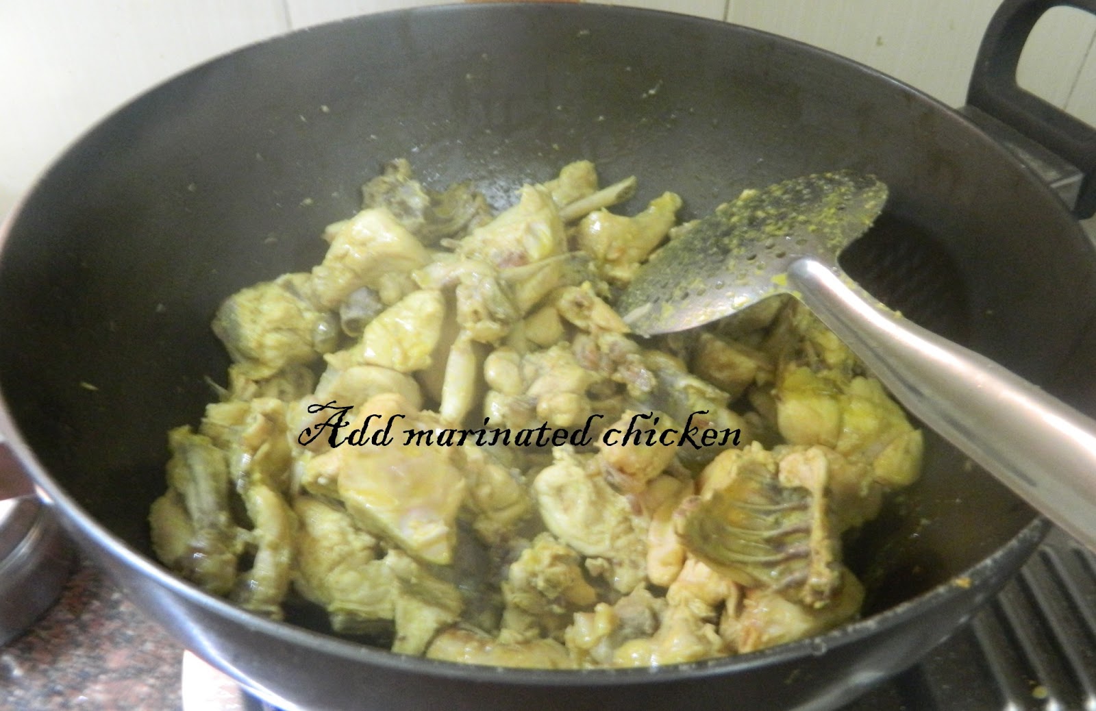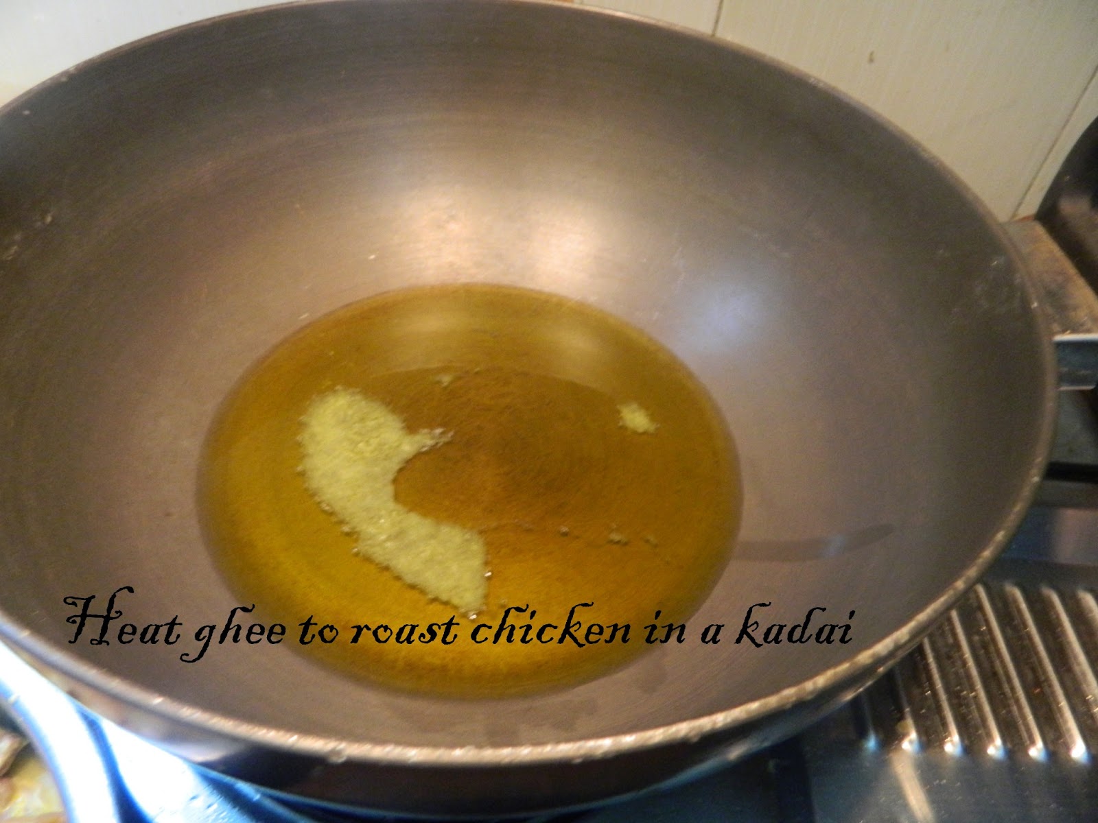 - Heat 1 cup ghee in a broad kadai and roast the marinated chicken in the ghee.