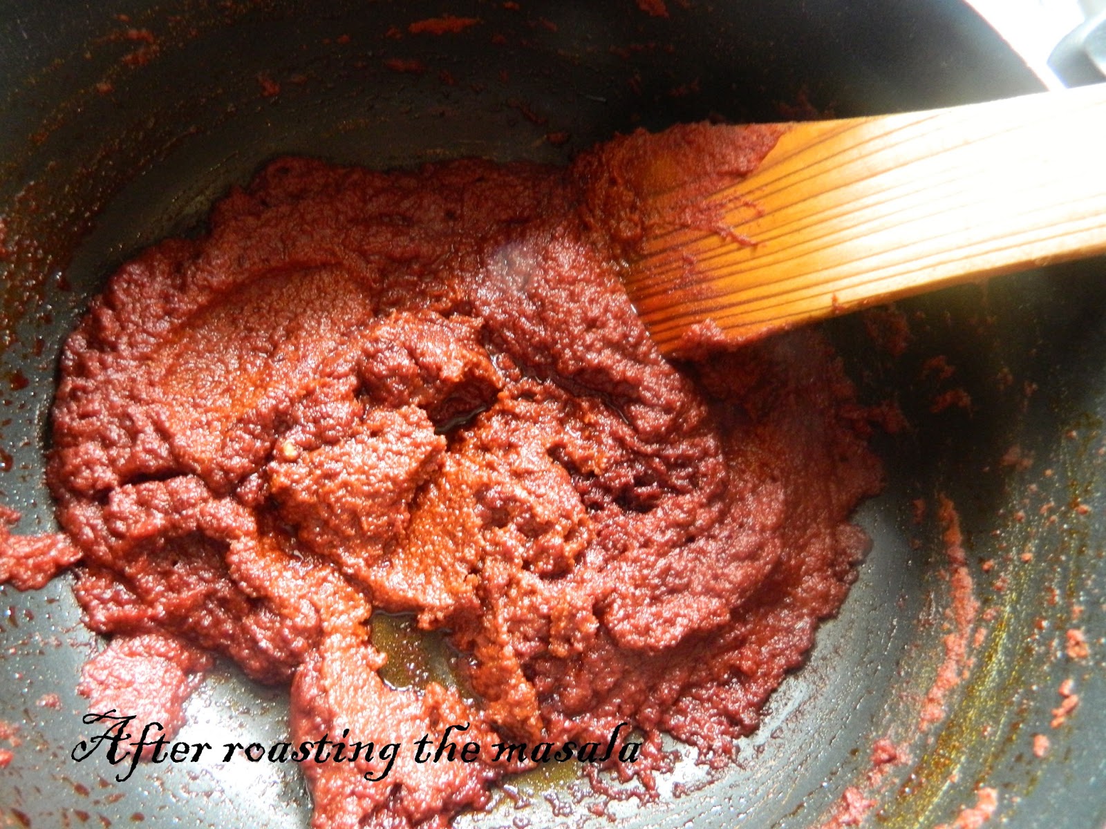 - Cool the roasted ingredients and grind it with tamarind,garlic and water to a smooth paste.