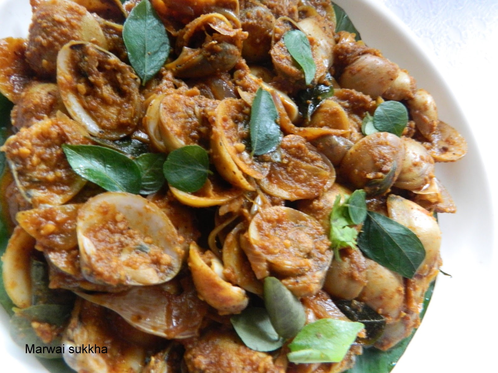 Marwai sukkha is again a Mangalorean specialty.I borrowed this recipe from my aunt Laxmi Padiyar where originally one of her friend had shared her this recipe…This is the recipe of Kori/chicken sukkha but here it is substituted with clams.This dish goes well with the main course especially with the boiled rice.For GSB style Kubbe sukkhe/clams sukkha refer here.