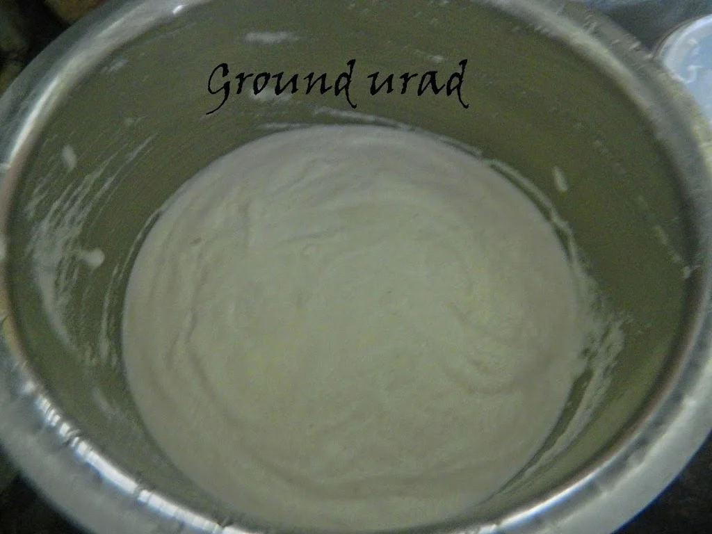 - Once soaked,wash the urad dal well and grind it in an electric grinder until light and fluffy.