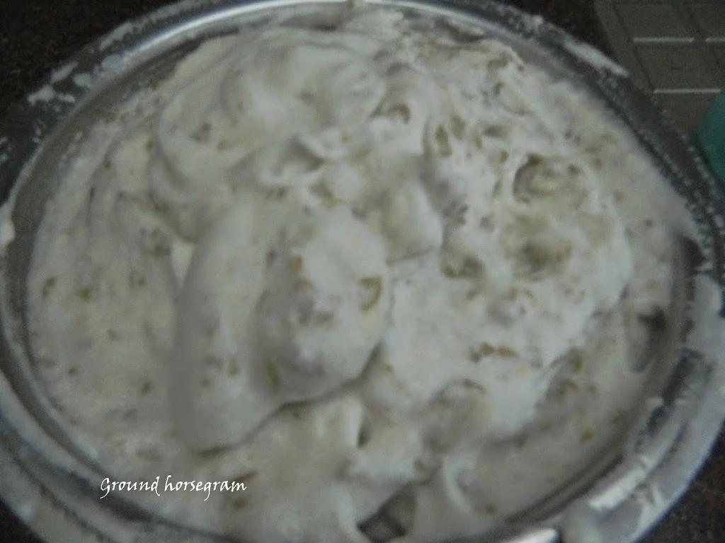 - Next morning add salt to taste and ground horsegram and beat the batter well.