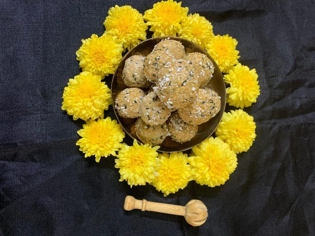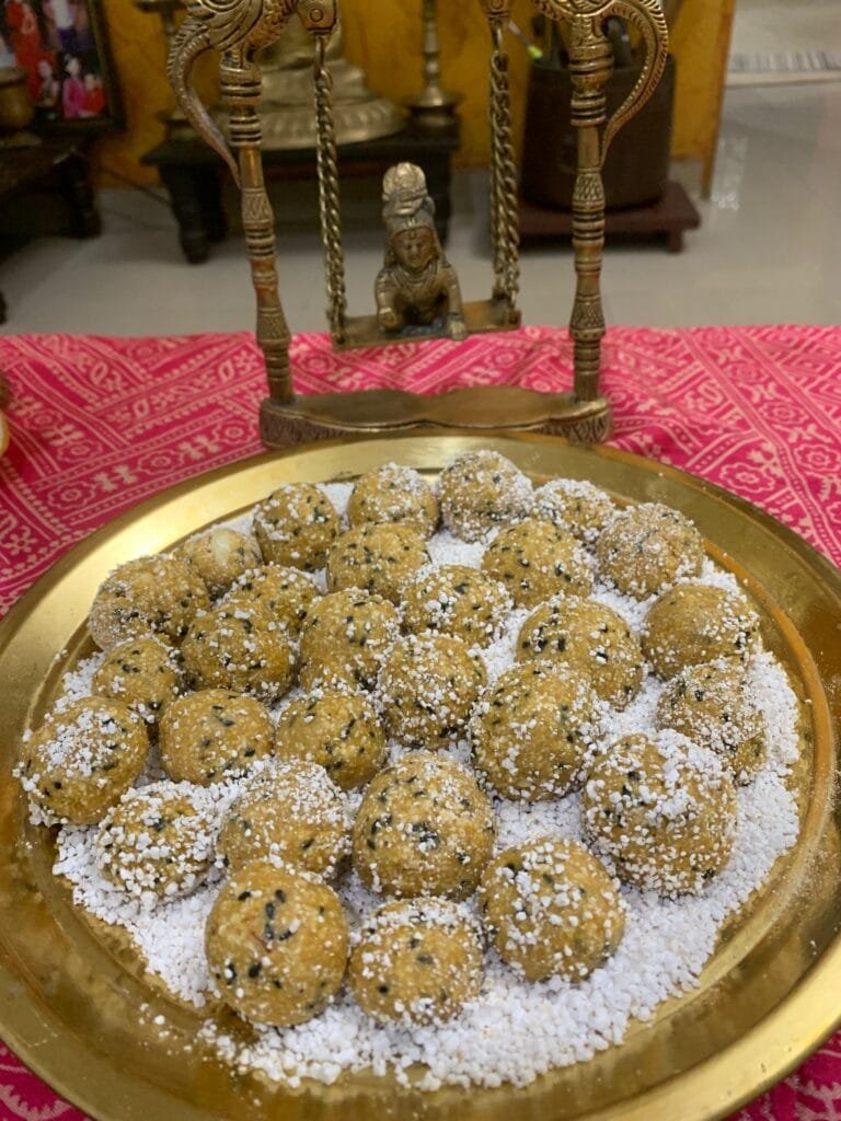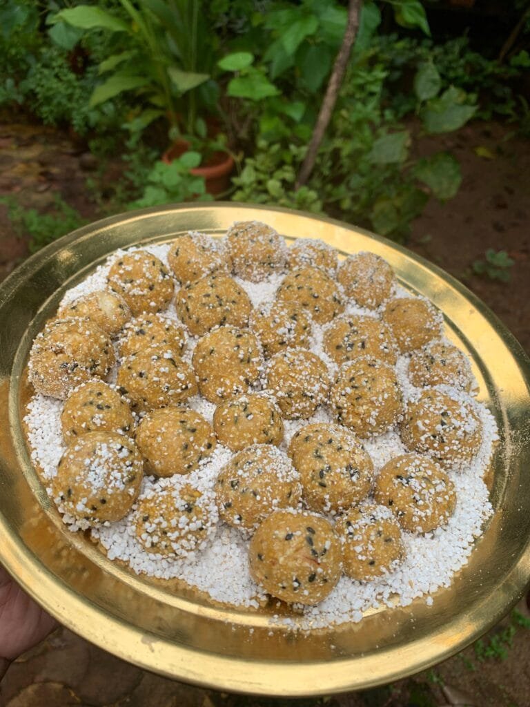 Ashtami undo/laddoo – a recipe I’ve been meaning to try for over a decade! Inspired by fellow food bloggers, I finally gave it a shot. For first-timers, I recommend starting with a small batch using half the measurements. I’ll share some tips from my experience. I used regular jaggery instead of the traditional “Anta God” sticky jaggery, which is usually available during festivals. I enlisted Amma’s help to shape the laddoos, as it requires two hands to work quickly. Despite my doubts, the laddoos turned out well!