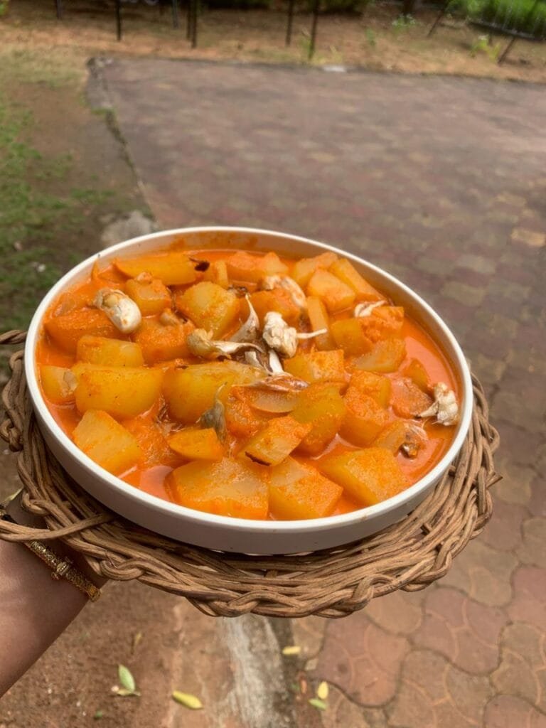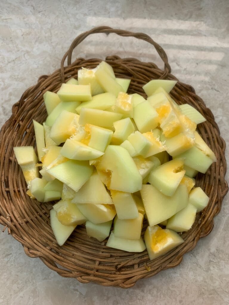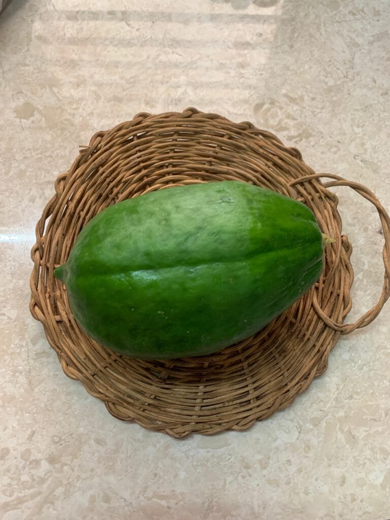 Harve Popashpala – raw papaya dish made with homegrown papaya! Pratham helped me pluck and chop it . My paternal granny, Aayi, used to make this often, and now Amma does. I got the recipe from Amma, and she says the masala should be mild, tangy, and sweet – not too overpowering. That’s why we add a bit more tamarind than usual.