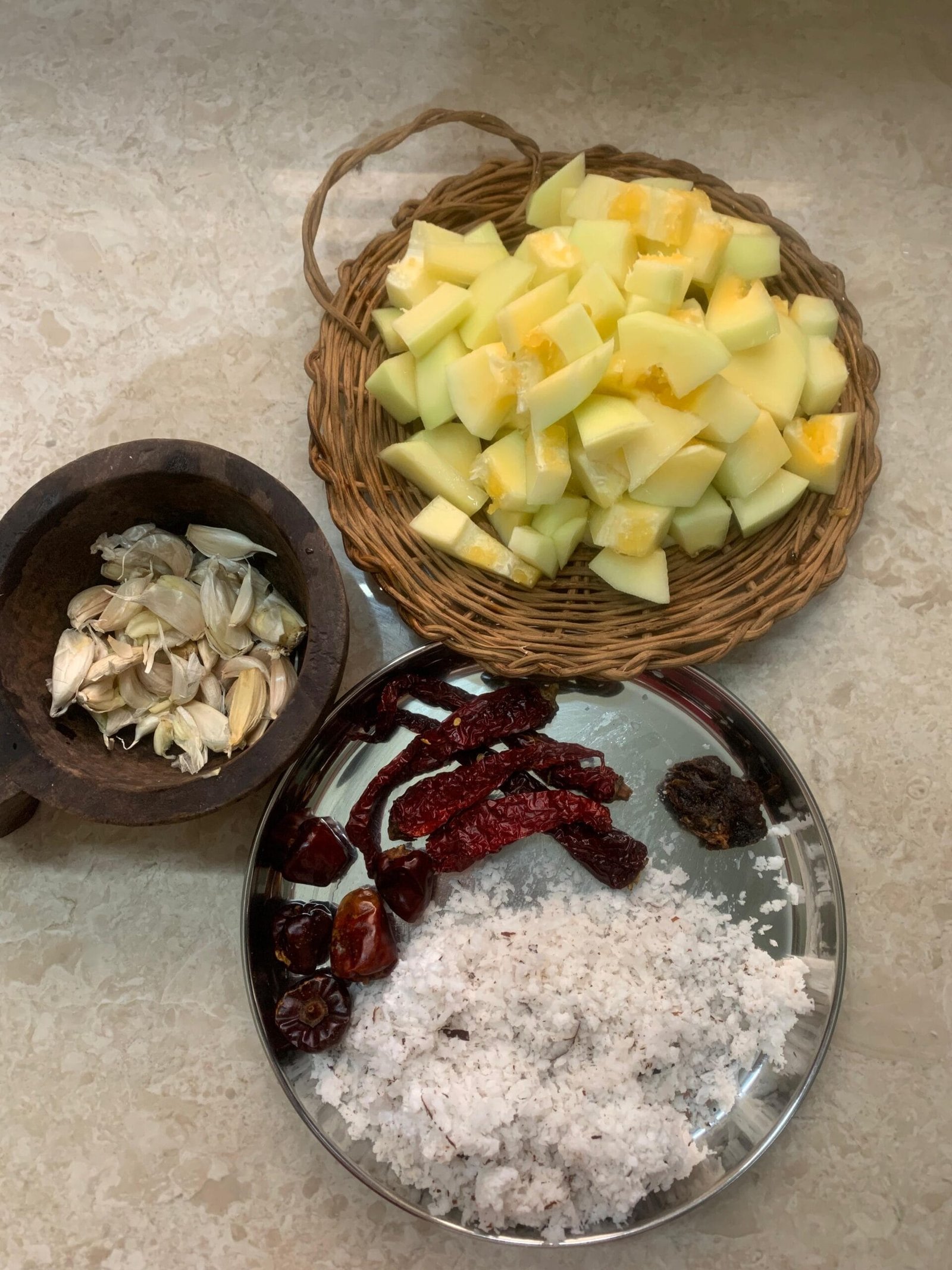 Harve Popashpala – raw papaya dish made with homegrown papaya! Pratham helped me pluck and chop it . My paternal granny, Aayi, used to make this often, and now Amma does. I got the recipe from Amma, and she says the masala should be mild, tangy, and sweet – not too overpowering. That’s why we add a bit more tamarind than usual.